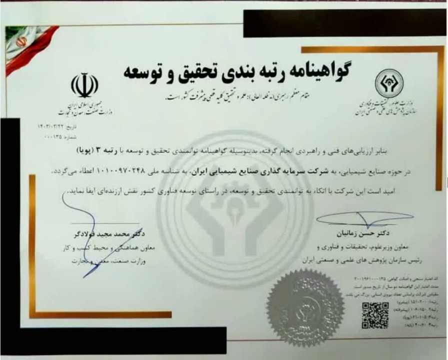 به گزارش روابط عمومی هلدینگ سرمایهگذاری صنایع شیمیایی ایران؛ در این گواهینامه که اوایل مرداد ماه جاری در جلسه تقدیم گواهینامه رتبهبندی پروانههای تحقیق و توسعه با حضور واحدهای رتبه برتر استان اصفهان در محل اداره آموزش، پژوهش و فناوری سازمان صنعت، معدن و تجارت استان برگزار شد؛ آمده است: «مطابق ارزیابیهای فنی و راهبردی انجام گرفته؛ گواهینامه توانمندی تحقیق و توسعه با رتبه 3 (پویا) در حوزه صنایع شیمیایی، به هلدینگ سرمایهگذاری صنایع شیمیایی ایران اعطاء میشود. امید است این شرکت با اتکاء به توانمندی تحقیق و توسعه؛ در راستای توسعه فناوری کشور نقش ارزندهای ایفا کند.»
