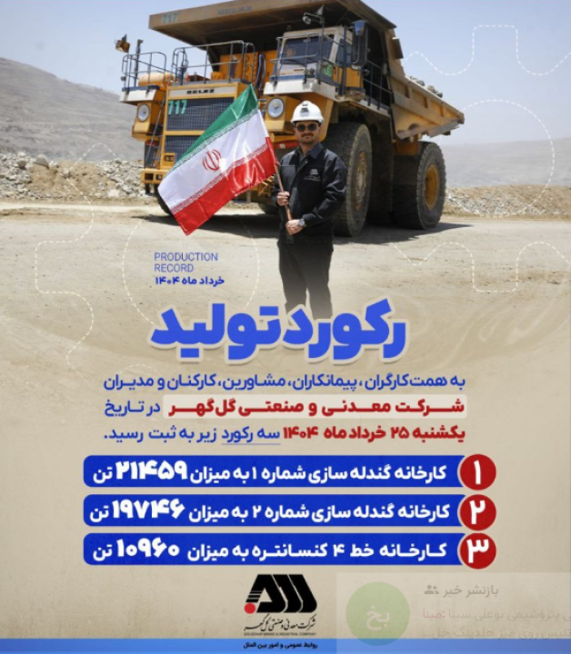 در ادامه روند رو‌به‌رشد تولید در مجموعه گل‌گهر، روز یکشنبه 25 خردادماه 1404 سه رکورد تازه در حوزه تولید مواد معدنی به ثبت رسید. این موفقیت حاصل تلاش مستمر و هم‌افزایی بین کارگران، پیمانکاران، مشاورین، کارکنان و مدیران شرکت معدنی و صنعتی گل‌گهر است.