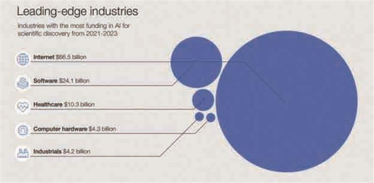 هوش مصنوعی (AI) اکتشافات علمی را از طریق هوش مصنوعی مولد (Generative AI) و مدل‌های بنیادی (Foundation models) متحول کرده است. این پیشرفت‌ها دانشمندان را قادر می‌سازد تا اکتشافاتی را که قبلاً غیرممکن بود انجام دهند و سرعت پیشرفت علمی را تسریع بخشند. نمونه‌های قابل‌توجه عبارت‌اند از Deep Mind’s AlphaFold که می‌تواند ساختارهای سه‌بعدی پروتئین‌ها را به‌دقت پیش‌بینی، خانواده جدیدی از آنتی‌بیوتیک‌ها را شناسایی و موادی را برای باتری‌های کارآمدتر کشف کند. دانشمندان اکنون در حال ساختن و استفاده از مدل‌های زبانی بزرگ (large language models) برای بررسی ادبیات علمی، طوفان فکری فرضیه‌های جدید با چت‌بات‌های هوش مصنوعی (AI chatbots) و ایجاد مدل‌های هوش مصنوعی برای تجزیه‌وتحلیل حجم وسیعی از داده‌ها هستند. این انقلاب مبتنی بر هوش مصنوعی نوید پیشرفت‌های چشمگیری در تشخیص، درمان و پیشگیری از بیماری‌ها، ایجاد مواد جدید برای فناوری‌های سبز و پیشرفت در علوم زیستی می‌دهد. بااین‌حال، چالش‌های اخلاقی از جمله خطرات حریم خصوصی، اختلالات اجتماعی مانند تغییر شیوه تعاملات اجتماعی و بازار کار و اثرات زیست‌محیطی مانند استخراج چشمگیر منابع باید مورد توجه قرار گیرند. شکل شماره 1 نشان‌دهنده صنایعی است که بیشترین سرمایه‌گذاری را در AI برای اکتشافات علمی از سال 2021 تا 2023 انجام داده‌اند.
