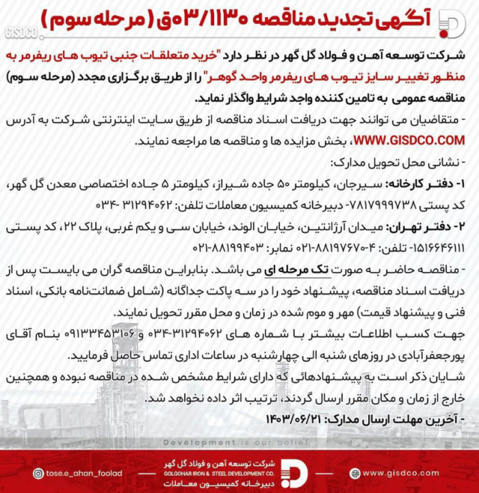 آگهی مناقصه 03/1130 شرکت توسعه آهن و فولاد گلگهر