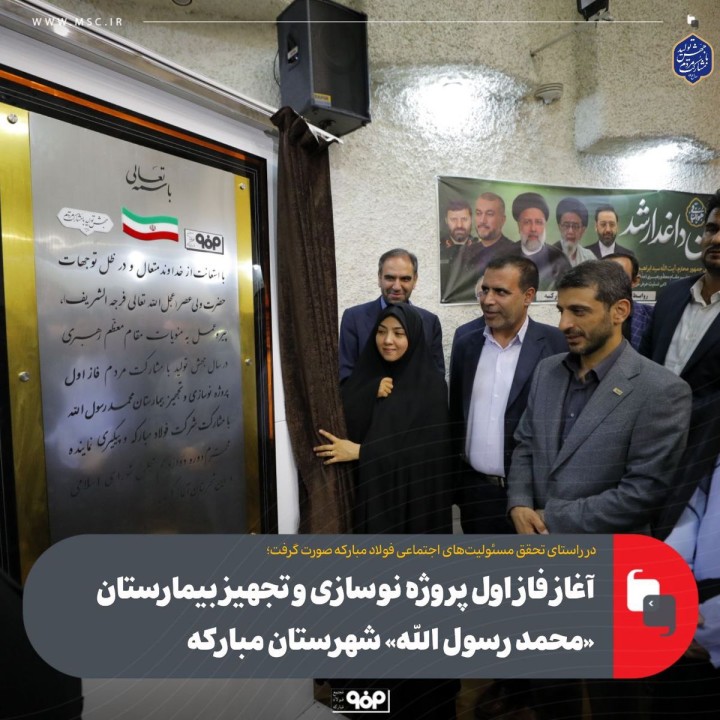 آیین آغاز فاز اول پروژه نوسازی و تجهیز بیمارستان «محمد رسولالله» شهرستان مبارکه با مشارکت فولاد مبارکه، امروز (شنبه 10 شهریور 1403)، با حضور نماینده مردم شریف شهرستان مبارکه در مجلس شورای اسلامی، رئیس دانشگاه علوم پزشکی اصفهان، امام جمعه، فرماندار شهرستان مبارکه برگزار شد.