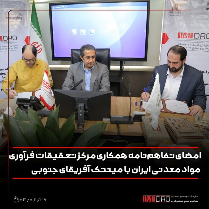 بنا به این گزارش، در مراسم مذکور که در حضور سرپرست ایمیدرو انجام گرفت، تفاهم نامه همکاری بین ضیالدین پورکریمی، رئیس مرکز تحقیقات فرآوری ایران و مهدی صفاری، مدیر بخش فرآوری شرکت مینتک آفریقای جنوبی امضا شد.