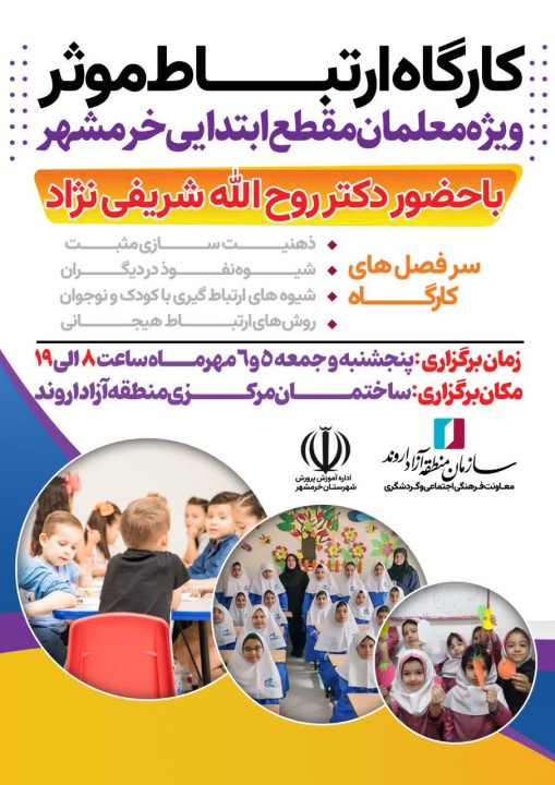 بر اساس این گزارش، سالن همایشهای سازمان منطقه آزاد اروند، روزهای پنجم و ششم مهرماه جاری از ساعت 8 صبح لغایت 19، میزبان دوره آموزشی «ارتباط مؤثر» با حضور «دکتر روحالله شریفینژاد» عضو سازمان نظام روانشناسی و مشاوره ایران، خواهد بود.