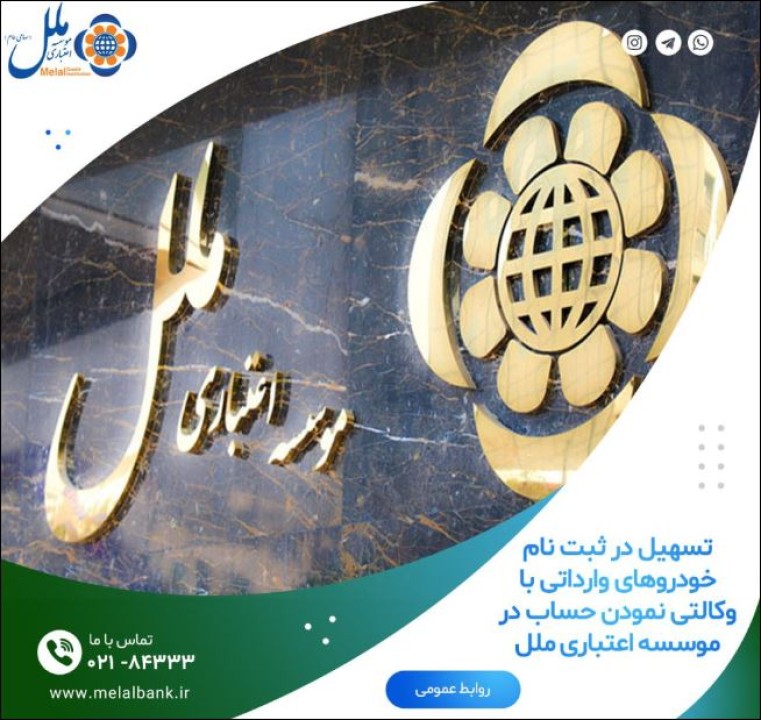 مشتریان محترم میتوانند به صورت غیرحضوری در موسسه اعتباری ملل نسبت به وکالتی نمودن حساب، به منظور ثبت نام در سامانه یکپارچه خودرو وارداتی اقدام نمایند.