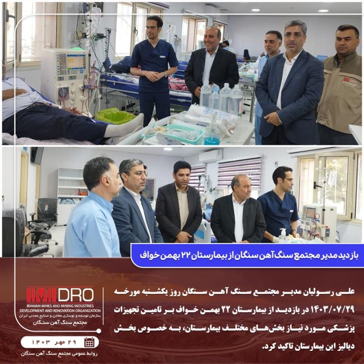 به گزارش روابط عمومی مجتمع، در این بازدید، مدیر مجتمع سنگ آهن ضمن ابراز قدردانی از تلاشهای کادر درمان بیمارستان، طی دیدار و گفتوگویی با مدیر شبکه بهداشت و درمان شهرستان خواف و بیماران بخش دیالیز، قول مساعد داد تا در راستای تهیه و تامین تجهیزات پزشکی مورد نیاز، بهویژه برای بخش دیالیز، اقدامات لازم را انجام دهد.