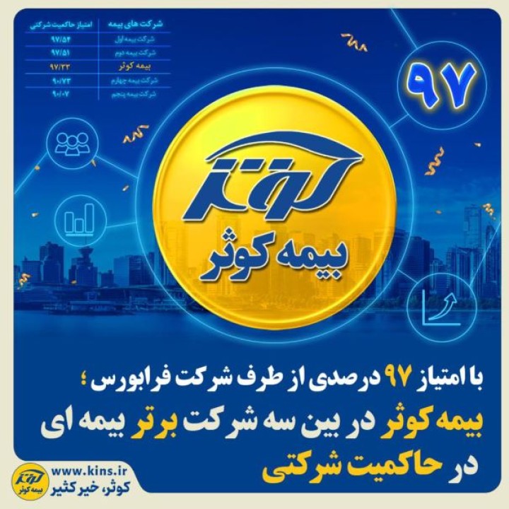 مطابق اطلاعیه شرکت فرابورس ایران، پس از امتیازدهی حاکمیت شرکتی ناشران پذیرفته شده در بازارهای فرابورس ایران بر اساس میزان رعایت ضوابط در دستور العملهای حاکمیت شرکتی، بیمه کوثر با کسب امتیاز 97حاکمیت شرکتی توانست بین 3 شرکت برتر بیمهای قرار گیرد.