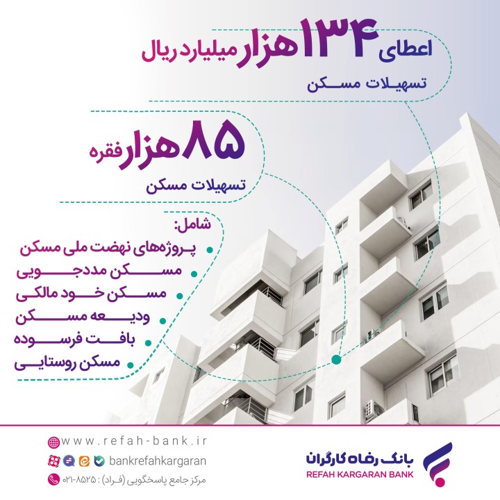 به گزارش روابط عمومی بانک رفاه کارگران، این تسهیلات در سرفصلهای خودمالکی، ودیعه مسکن، پروژههای نهضت ملی مسکن، بافت فرسوده، مرمت و مقاومسازی واحدهای مسکونی، روستایی، نخبگان، اعضاء هیئت علمی، خانواده معظم شهدا، جانبازان و ایثارگران معزز، و.... به متقاضیان واجد شرایط پرداخت شده است.