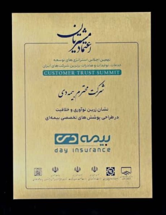 شرکت بیمه دی در نهمین همایش ملی اجلاس استراتژی‌های توسعه خدمات، تولیدات و صادرات برترین شرکت‌های ایران، موفق به کسب نشان زرین نوآوری و خلاقیت در طراحی پوشش‌های بیمه شد.