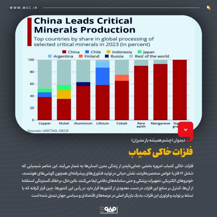 بااینحال، برخلاف گستردگی استفاده از آنها، کنترل بر منابع این فلزات در دست معدودی از کشورها قرار دارد. در رأس این کشورها، چین قرار گرفته که با تسلط بر تولید و فراوری این فلزات، به یک بازیگر اصلی در عرصههای اقتصادی و سیاسی جهان تبدیل شده است. این تسلط نهتنها بر تولید، بلکه بر فراوری فلزات خاکی کمیاب، موجب شده است که چین به مرجع اصلی تأمین این منابع استراتژیک بدل شود.