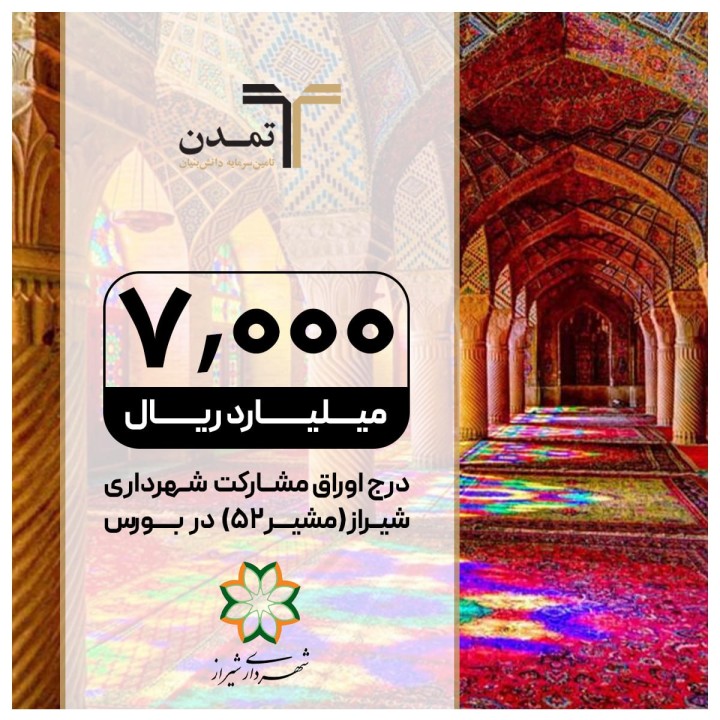 به گزارش مدیریت ارتباطات و رسانه تامین سرمایه تمدن ، اوراق مشارکت شهرداری شیراز به مبلغ 7,000 میلیارد ریال با نرخ سود علیالحساب 18 درصد سالانه و معاف از مالیات، طبق مجوز شماره 320826 / 01 مورخ 27 / 12 / 1401 بانک مرکزی جمهوری اسلامی ایران، به منظور توسعه قطار شهری (فاز 3 خط دو و فاز 2 توسعه غربی خط یک (خط سه))، از تاریخ 19 / 09 / 1403 با نماد "مشیر52" در فهرست نرخهای بازار اوراق بدهی بورس تهران درج شد. مدت اوراق 4 سال و مواعد پرداخت آن هر 3 ماه یکبار از تاریخ انتشار اوراق است. همچنین ارکان اوراق به شرح زیر میباشد: