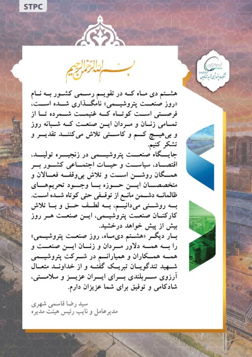 پیام تبریک مدیرعامل پتروشیمی شهید تندگویان به مناسبت هشتم دی‌ماه، روز صنعت پتروشیمی