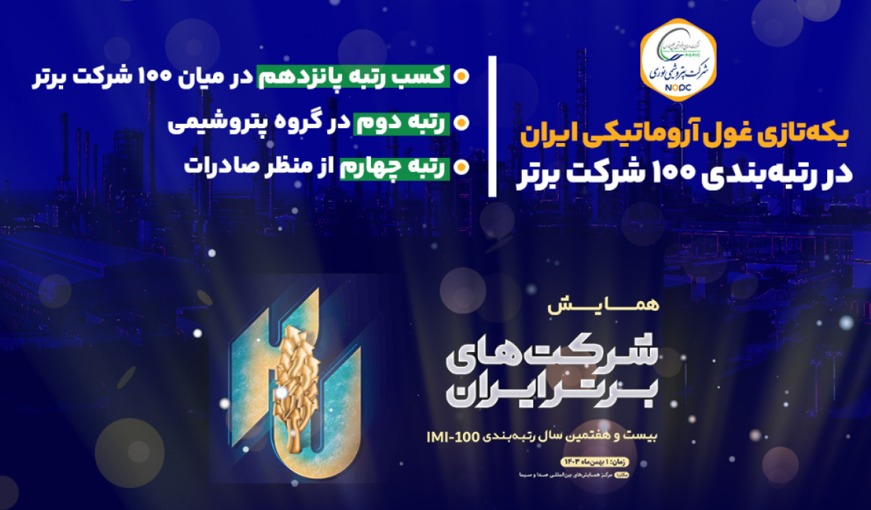 رتبهبندی 100 شرکت برتر ایران یکی از معتبرترین جایزه های ملی ست که سالانه با حضور بزرگ ترین شرکت های تولیدی و خدماتی کشور، توسط سازمان مدیریت صنعتی و با ارزیابی های دقیق در 33 شاخص کلیدی انجام می شود.