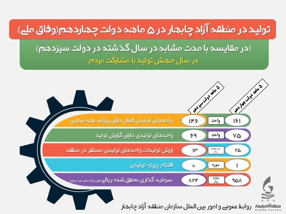 عملکرد شاخص‌های تولید در منطقه آزاد چابهار در سال جهش تولید با مشارکت مردم در ۵ ماهه دولت چهاردهم در مقایسه با دوره مشابه دولت سیزدهم در سال گذشته بیانگر رشد در زمینه‌های مختلف است.