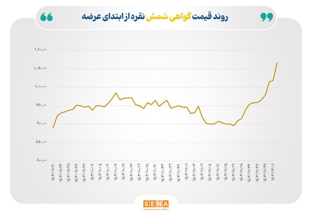در هفته گذشته، منحنی قیمت گواهی شمش نقره، روندی صعودی را تجربه کرد و برای نخستین بار به بالای 100 هزار تومان رسید. در 3 روز معاملاتی قیمت هر برگه گواهی شمش نقره بالای 100 هزار تومان معامله شد.