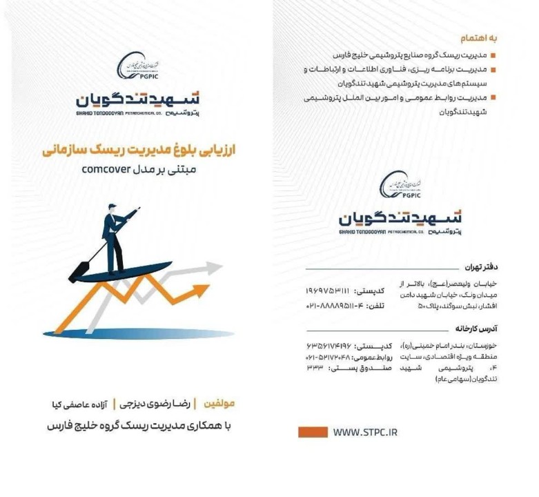 کتابچه «ارزیابی بلوغ مدیریت ریسک سازمانی»، توسط شرکت پتروشیمی تندگویان و همکاری مدیریت ریسک هلدینگ خلیجفارس مبتنی بر مدل بلوغ ریسک Comcover توسط رضا رضوی دیزجی و آزاده عاصفی کیا به رشته تحریر درآمد و منتشر شد.