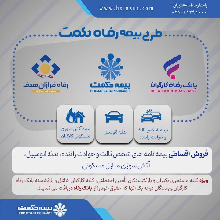 گفتنی است ، متقاضیان عزیز برای کسب اطلاعات بیشتر ، می‌توانند به شعب و نمایندگی های سراسر کشور شرکت بیمه حکمت صبا و شعب بانک رفاه مراجعه فرمایند.