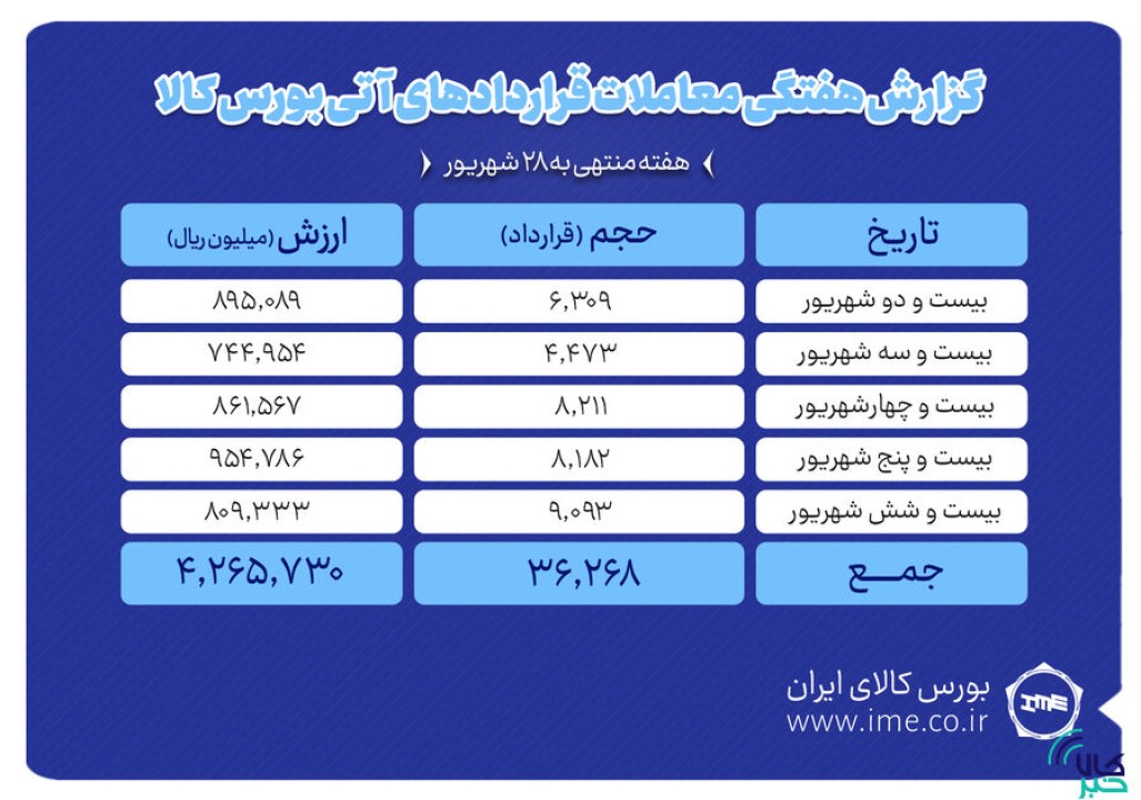 در هفته گذشته بالغ بر 36 هزار قراردادآتی به ارزش 426 میلیارد تومان منعقد شد. بیشترین ارزش معاملات نیز به روز 25 شهریور اختصاص یافت به طوری که در این روز 8 هزار و 182 قرارداد به ارزش بیش از 95 میلیارد تومان منعقد شد.
